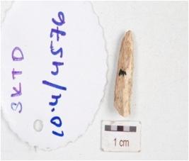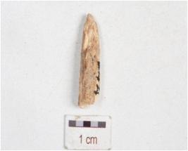 | Description / विवरण | Fragment of a bone point, broken into two pieces pointed one end, broken other end and weathered surface. |