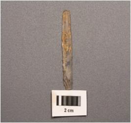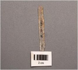 | Description / विवरण | Chalcedony parallel sided blade with a double ridge, used wear marks on one side cutting edge. |