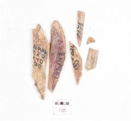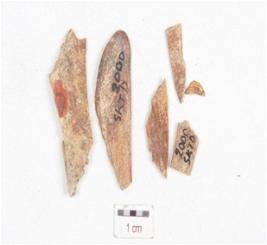 | Description / विवरण | Fragment of a scraper made on charred bone, polished surface, sharp edges and broken into many pieces. |