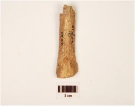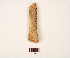 | Description / विवरण | A fragment of bone point, broken top, slightly triangular base, rough surface and off white in colour. |