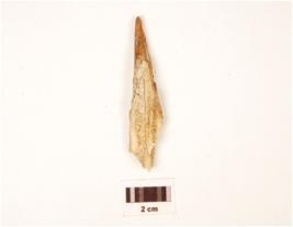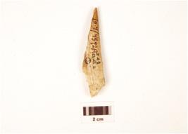 | Description / विवरण | A fragment of bone point, pointed top, partly broken, cracks on surface, polished top, hollow inside and off white in colour. |