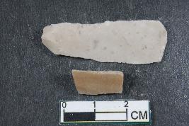 | Description / विवरण | Fragment of a blade with one dorsal ridge and a bulb of percussion on ventral side having smooth surface. Shorter blade along with two dorsal ridges has length equivalent to 1.5 cm. |