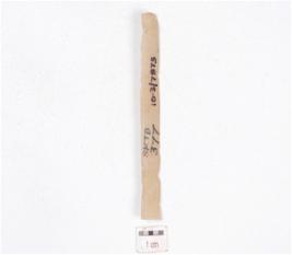 | Description / विवरण | A blade made on chert, mid ridge on dorsal side, diffused bulb on ventral side and irregular marks on edges. |