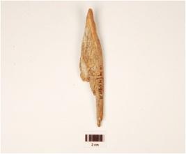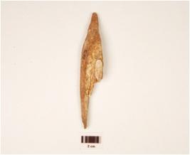 | Description / विवरण | A fragment of bone point partly broken, pointed ends, rough surface, improper edges, brown in colour and polished. |