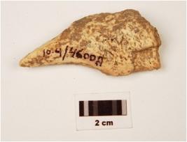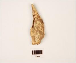 | Description / विवरण | A fragment of bone object, pointed top, uneven surface, hollow inside, partly broken and off white in colour. |