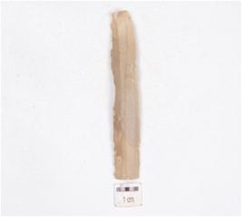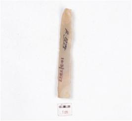 | Description / विवरण | A blade made on chert, two ridges on dorsal side, prominent bulb on ventral side and use wear marks on edges. |