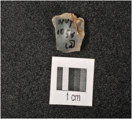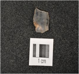| Description / विवरण | Fragment of chalcedony blade with two ridges on dorsal side, prepared platform, defused bulb on ventral side, broken along at distal end, use wear marks on cutting edges and trapezoidal in section. |