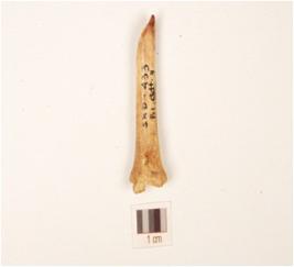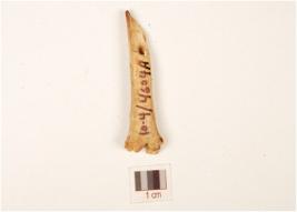 | Description / विवरण | A fragment of bone point, partly broken from top, uneven base, hollow from inside, polished, off white in colour and brown pointed top. |