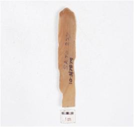 | Description / विवरण | A blade made on chert, mid ridge on dorsal side, diffused bulb on ventral side and use wear marks on edges. |