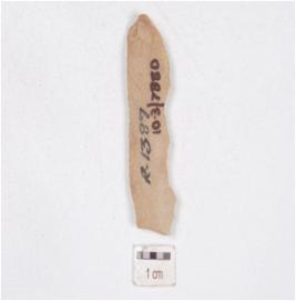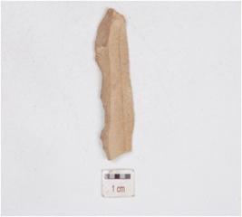 | Description / विवरण | A blade made on chert, mid ridge on dorsal side, diffused bulb on ventral side and irregular retouch marks on edges. |