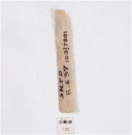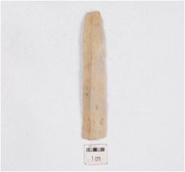 | Description / विवरण | A blade made on chert, mid ridge on dorsal side, diffused bulb on vental side and use wear marks on edges. |