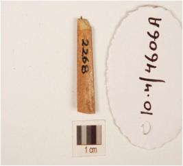 | Description / विवरण | A fragment of bone point, broken ends, flat surface, brown in colour, polished, proper edges and thin in character. |