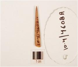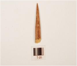 | Description / विवरण | A fragment of bone point, partly broken from end, pointed top, flat surface, proper edges, polished, brown in colour and thin in character. |