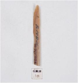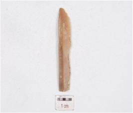 | Description / विवरण | A blade made on chert, mid ridge on dorsal side, diffused bulb on ventral side and use wear marks on edges. |