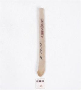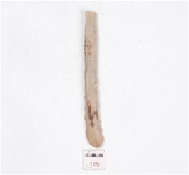 | Description / विवरण | A blade made on chert, mid ridge on dorsal side, prominent bulb on ventral side and use wear marks on edges. |