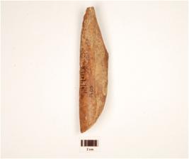 | Description / विवरण | A fragment of bone point broken ends, curved surface, hollow from inside and polished brown in colour. |