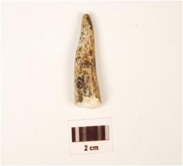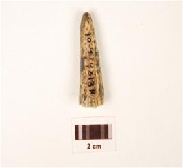 | Description / विवरण | A fragment of bone point, cone shaped, pointed top, circular base, pin hole on base, off white in colour and polished. |