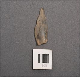 | Description / विवरण | A chalcedony point with a prominent ridge on dorsal side, defused bulb on ventral side, broken along at distal end and use wear marks on edges. |