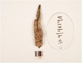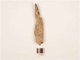 | Description / विवरण | A fragment of bone object, pointed top, broken from bottom, polished top, uneven in shape, irregular edges and brown in colour. |