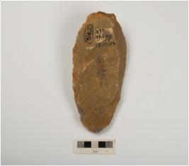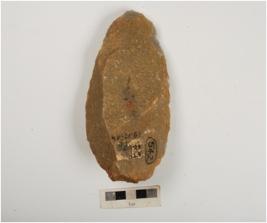 | Description / विवरण | A handaxe made on quartzite flake, soft hammer technique, flake scars on both side, prepared platform and retouched mark along cutting edges. |