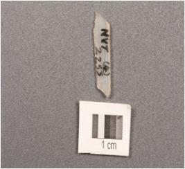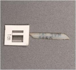 | Description / विवरण | Chalcedony parallel sided blade with double ridge, broken distal end, used wear mark on cutting edge. |