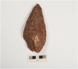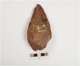 | Description / विवरण | A miniature handaxe made on quartzite pebble by soft hammer technique, flake scars on both sides and sharp cutting edges on both sides. |