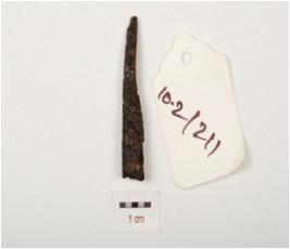 | Description / विवरण | Fragment of iron nail, pointed one end, other end is broken, rough surface and chemically treated. |