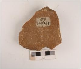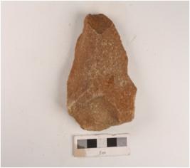 | Description / विवरण | A stone scraper made on end-struck flake, regular retouching marks on edges and prepared platform. |