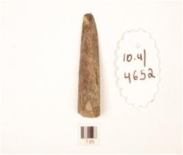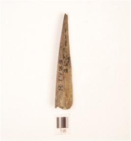 | Description / विवरण | Fragment of a bone point broken, tapering, rough surface and black in colour. |