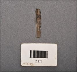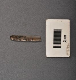 | Description / विवरण | Parallel sided microlith blade made on chalcedony with prominent mid ridge on dorsal and defused bulb on ventral. Triangular in section, use wear marks on cutting edges and broken at distal end. |