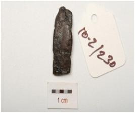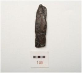 | Description / विवरण | Fragment of iron chisel, flat surface, broken end rough surface, chemically treated and thin in section. |