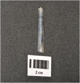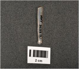 | Description / विवरण | Microlith blade with double ridge on dorsal, partly chipped off defused bulb on ventral, trapezoidal section and use wear marks on cutting edge. |