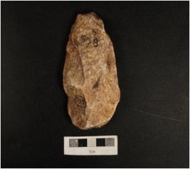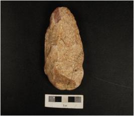 | Description / विवरण | A miniature handaxe made on quartzite pebble by soft hammer technique, flake scars on both sides, retouched mark along cutting edges and prepared platform. |