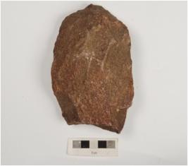 | Description / विवरण | A handaxe made on quartzite flake, flake scars on both side, retouched edges and broken along one side. |