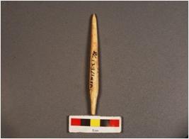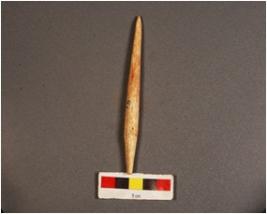 | Description / विवरण | Long bone arrow head, thin but slightly thick from top with incised circle, pointed end, other is broken, yellow in colour. |