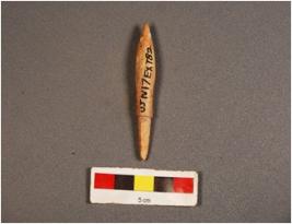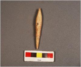 | Description / विवरण | Cylindrical shaped bone needle, pointed end, thick from bottom, stains on surface. |