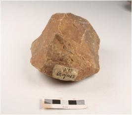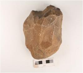 | Description / विवरण | Unifacial chopper made on quartzite with flake scars on dorsal, bulb on ventral and irregular retouches on working edge and cortex on posterior end. |
