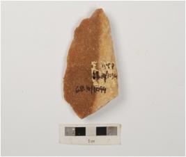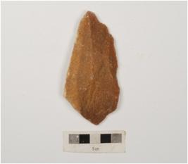| Description / विवरण | Scraper on a end struck flake, diffused bulb on ventral side, flake scars on dorsal and regular retouched edges. |