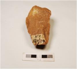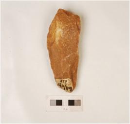 | Description / विवरण | A handaxe made on quartzite pebble with flake scars on both sides and irregular edges. |