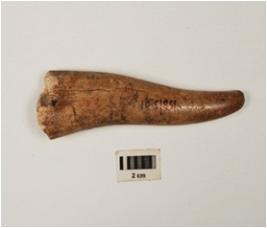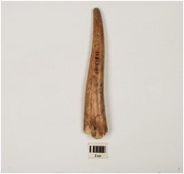 | Description / विवरण | Point of antler horn with polished surface and broad at one end, vertical and horizontal cracks on surface. |
