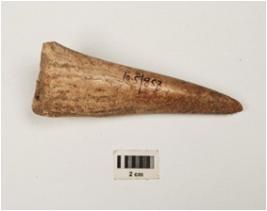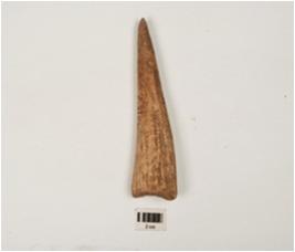 | Description / विवरण | Long point of antler horn with polished and vertical cracks on surface, pointed at one end and broad at other end. |