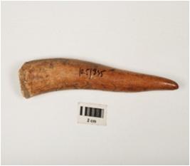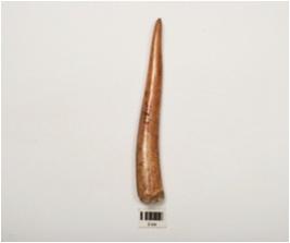| Description / विवरण | Point of antler horn with polished and vertical crack on surface, broad at one end and pointed at other, brown in colour and circular in section. |