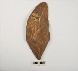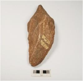 | Description / विवरण | A bifacial handaxe made on quartzite with flake scars on both sides, pointed ends and irregular retouches on cutting edges. |
