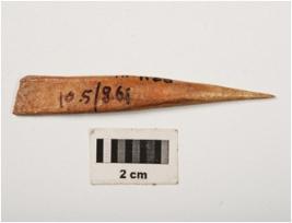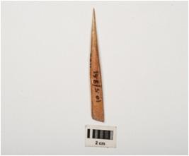 | Description / विवरण | Bone point with polished and flat surface, pointed at one end and partly broken at flat end, rectangular in section and light brown in colour. |