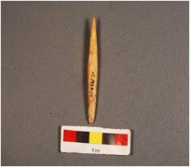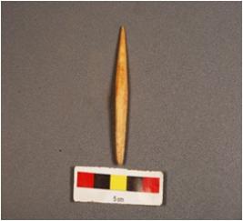 | Description / विवरण | Bone arrow head, one end is pointed, other is broken and has crack with stains, slightly thick from middle, yellow in colour. |