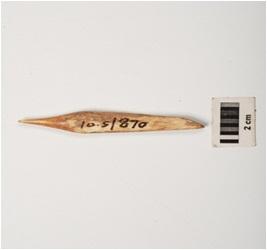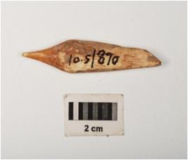 | Description / विवरण | Bone awl with polished surface, slightly broken pointed tip, rectangular section and light brown in colour. |