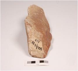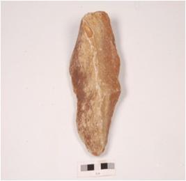 | Description / विवरण | A handaxe made on quartzite, flaking marks on both surface, prepared platform and irregular retouch at cutting edge. |