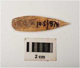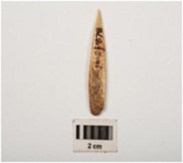 | Description / विवरण | Bone arrowhead with polished surface and partly broken pointed end, rectangular in section and cream in colour. |