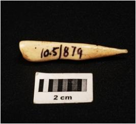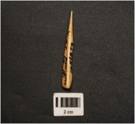 | Description / विवरण | Bone point, small in size having polished surface, slightly broken pointed end, triangular section and cream in colour. |
