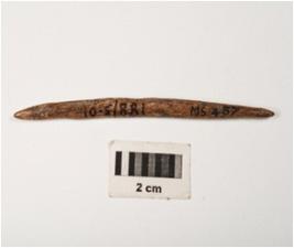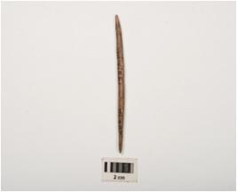 | Description / विवरण | Bone point with smooth surface, polished towards pointed end, circular section and dark brown in colour. |